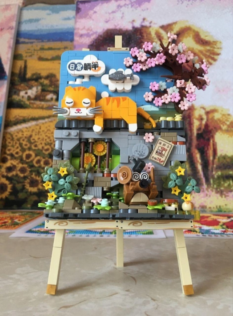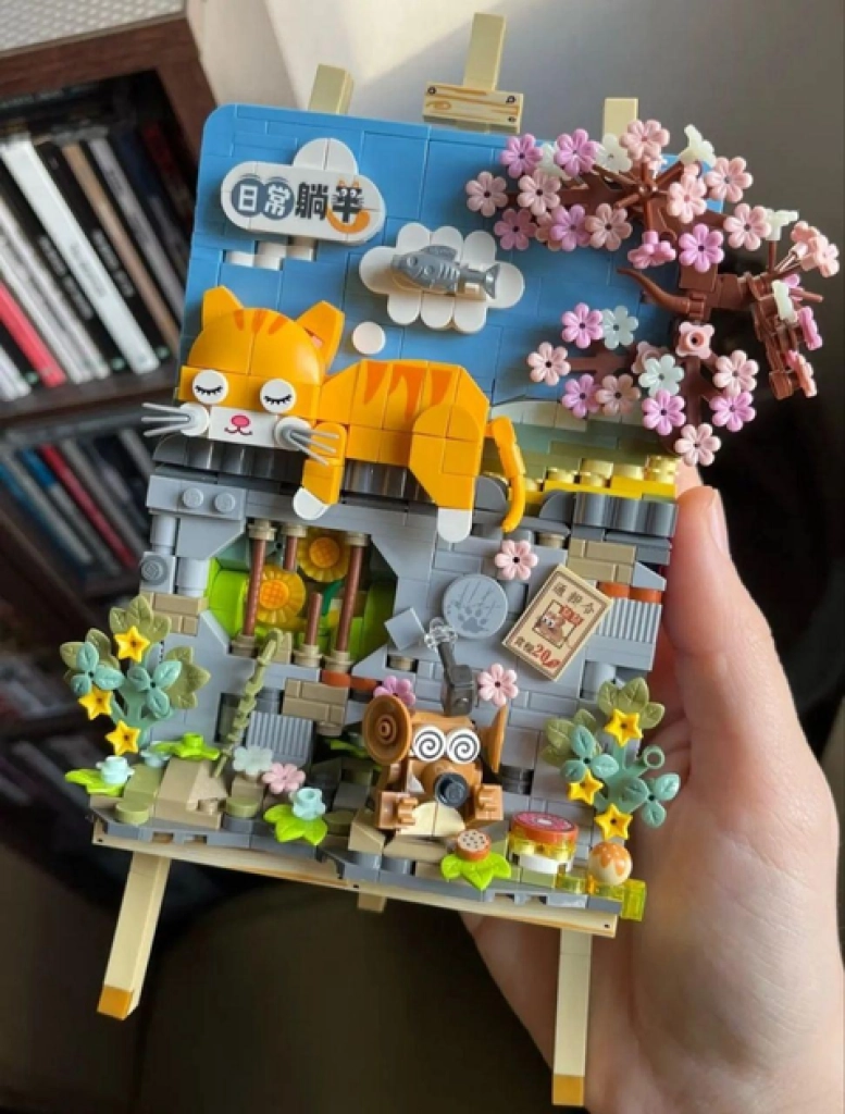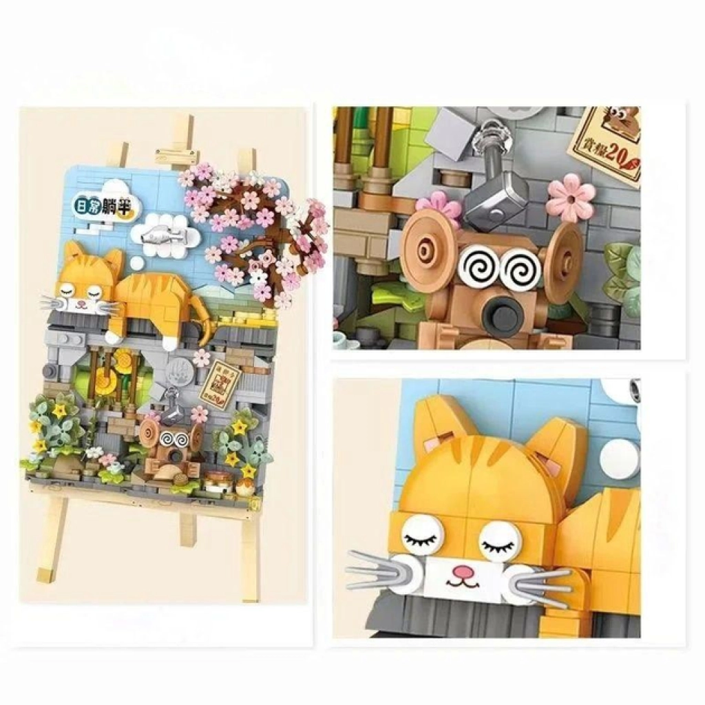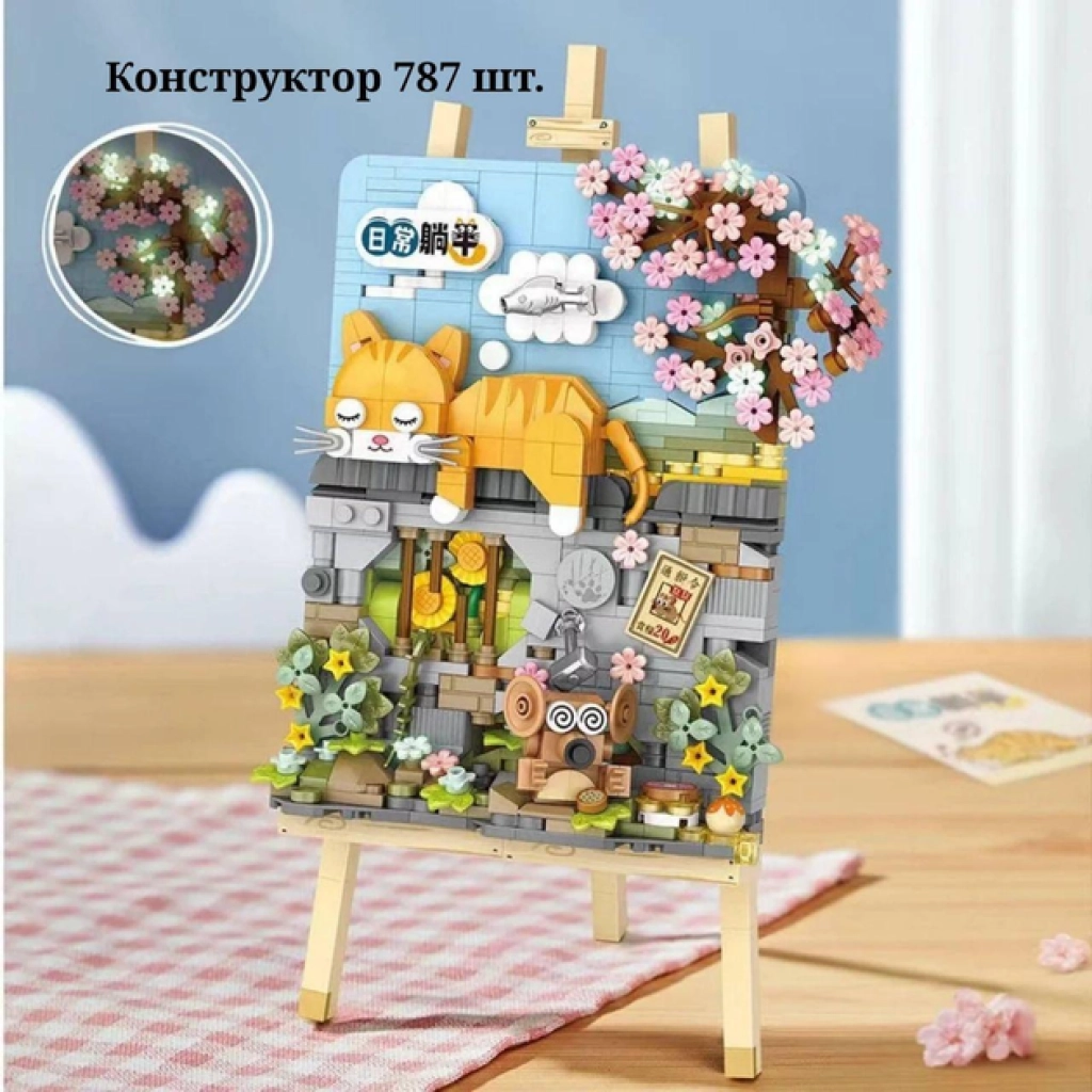 - 3D-ефект: деталі конструктора збираються в об'ємну картину з милим котиком, деревом сакури та деталізованими елементами природи.