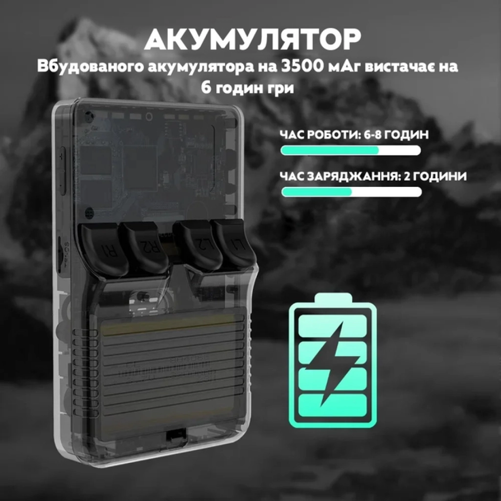 Тривала автономність: Акумулятор ємністю 3500 мАг дозволяє грати до 5 годин без перерви. Консоль також оснащена потужним залізом-64-бітним чотириядерним процесором RK3326 (1,5 ГГц) і 1 ГБ оперативно їпам’яті DDR 3для плавного геймплею. Рекордні характеристики у компактному корпусі! Вага пристрою -всього 190 грамів.
