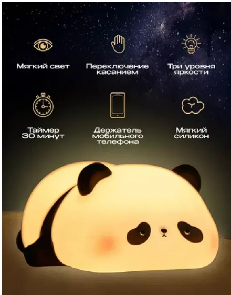 Силіконовий нічник у формі панди обіцяє внести м'яке світло і затишок у ваш інтер'єр. Цей LED світильник, виготовлений із м'якого силікону, не тільки захищає внутрішній акумулятор і діодну лампу, а й надає нічнику унікального тактильного задоволення. Ви зможете тримати його в руці, "тискати" і стискати, створюючи комфортне оточення.