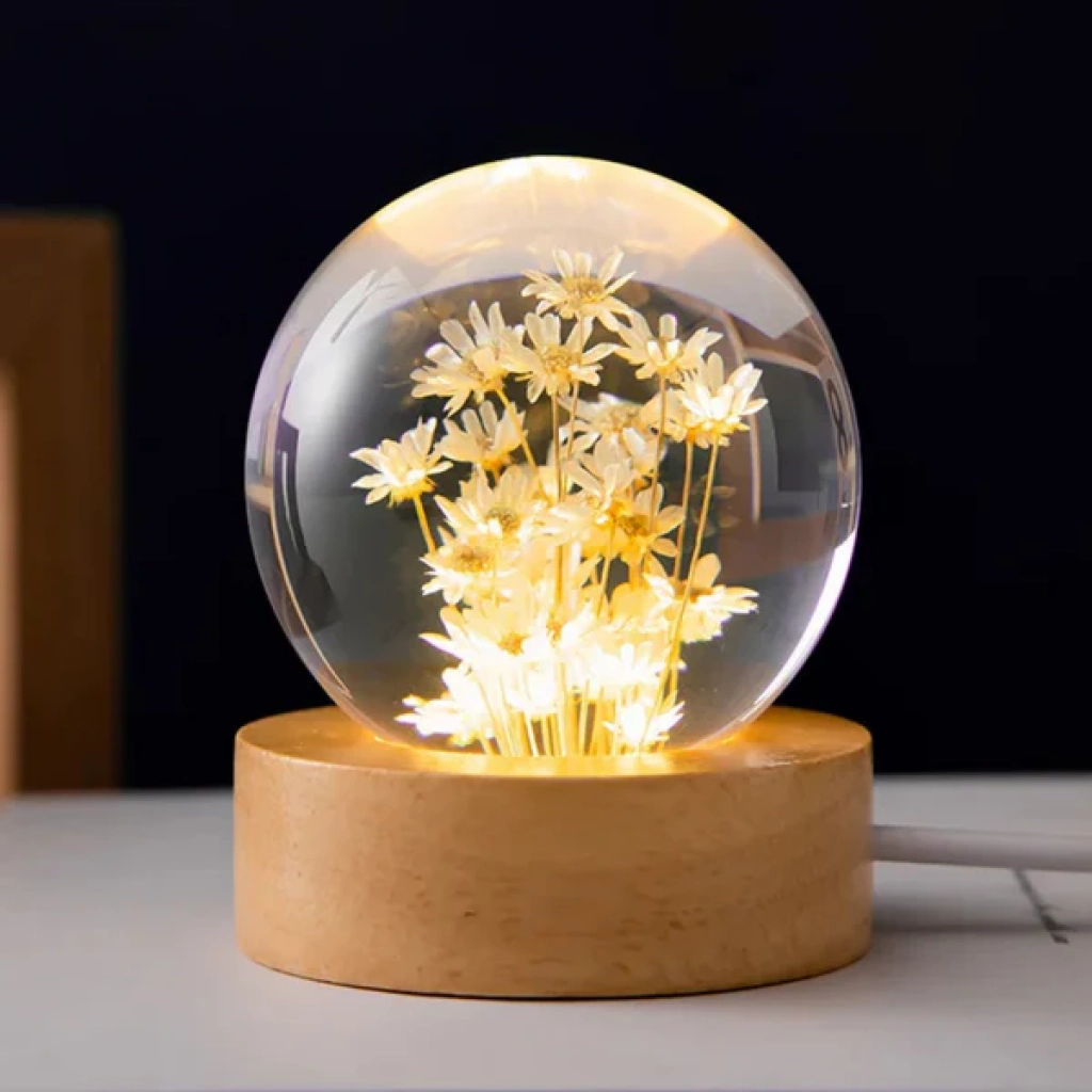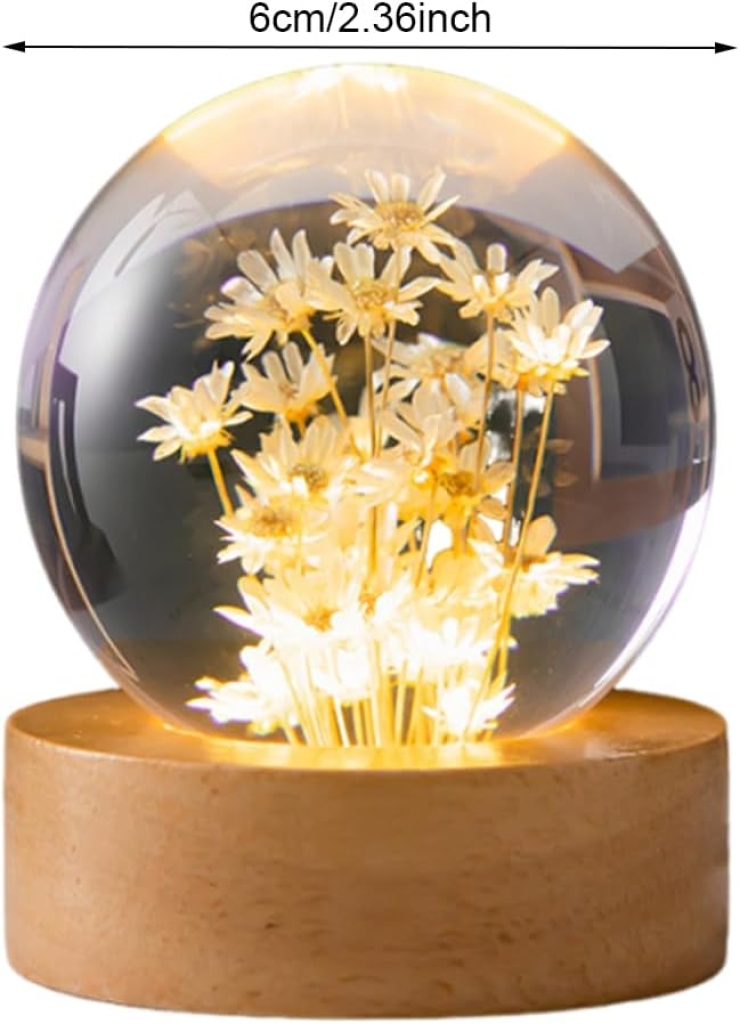 ЕЛЕГАНТНА ВІЧНА КВІТКОВА КРИШТАЛЕВА КУЛЯ: Високоякісна дерев'яна основа не тільки забезпечує стабільність, але й ідеально поєднується з будь-яким декором кімнати та підкреслює загальну красу кришталевої кулі-лампи з ромашки.